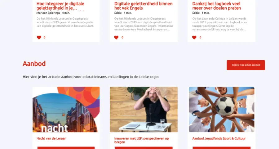 Om onderwijsprofessionals in de Leidse regio te helpen is er een nieuw platform dat alle projecten en initiatieven in de regio bij elkaar brengt: https://onderwijsindeleidseregio.nl. Alle aanwezige kennis in het onderwijsveld staat overzichtelijk bij elkaar, waardoor onderwijsprofessionals op een snelle, simpele manier kennis kunnen delen en er geen waardevolle informatie verloren gaat. Uniek is dat studenten het platform vullen en beheren.